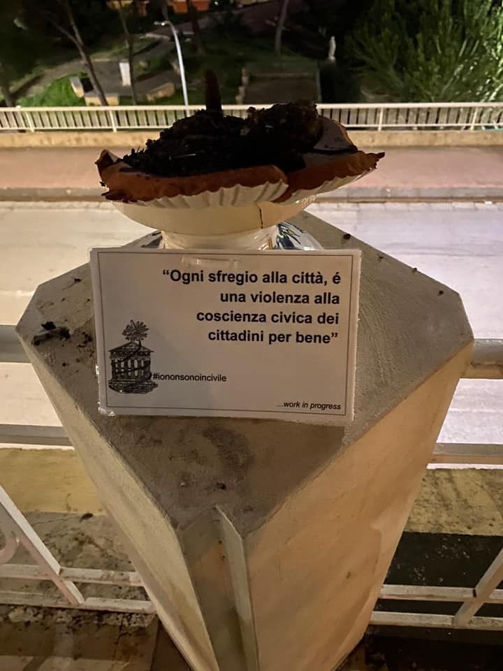 “Ogni sfregio alla città è una violenza alla coscienza civica dei cittadini” , così si legge nella targa apposta accanto al vaso rotto da un atto gratuito e stupido compiuto da vandali, al viale della Vittoria, per ricordare la ferita che la comunità subisce a seguito di gesti così inqualificabili.