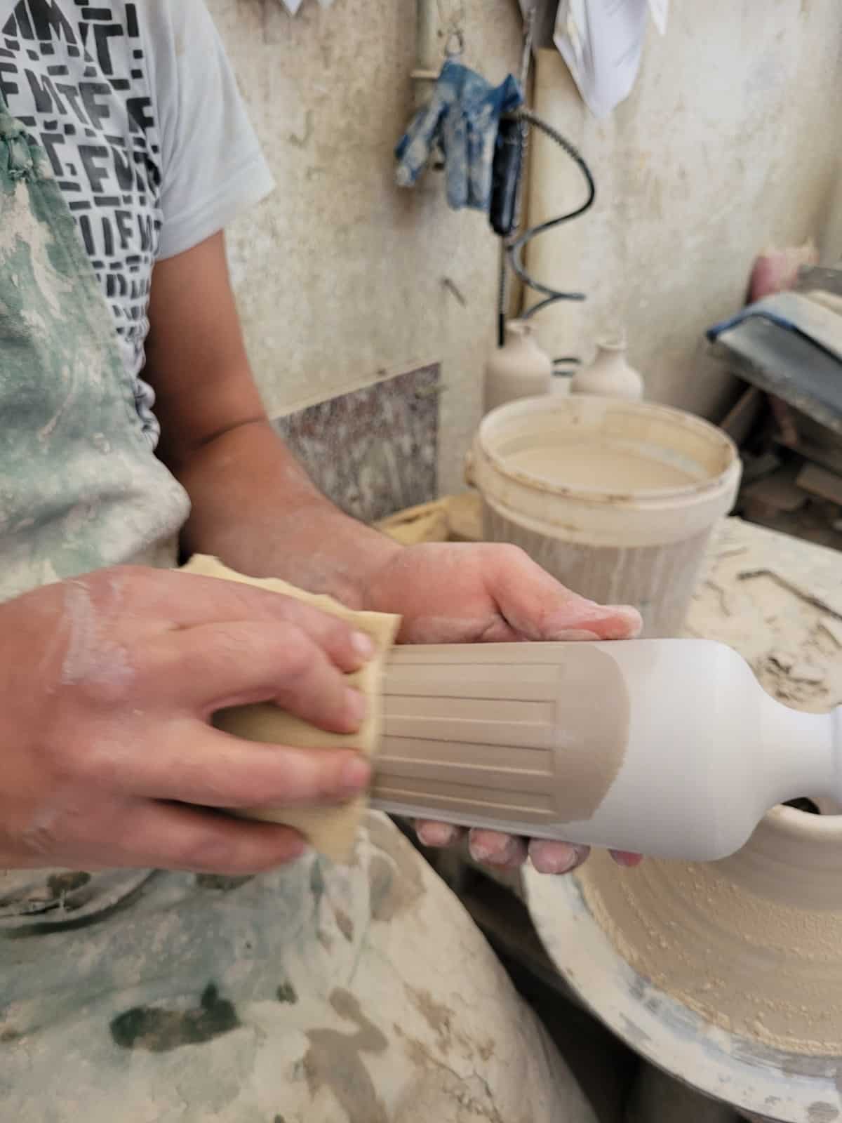 Dopo la creazione del modello “madre” si procede con il colaggio di argilla bianca allo stato liquido, una volta essiccata naturalmente si procede alla rifinitura a mano e sul tornio, e poi la prima cottura in forno. Si ottiene così la “terracotta” su cui procedere con la smaltatura a doppio colore (nero e rosso-arancio) e poi ancora una volta in forno dove gli smalti vetrificano e la bottiglia si trasforma da terracotta in “ceramica”.