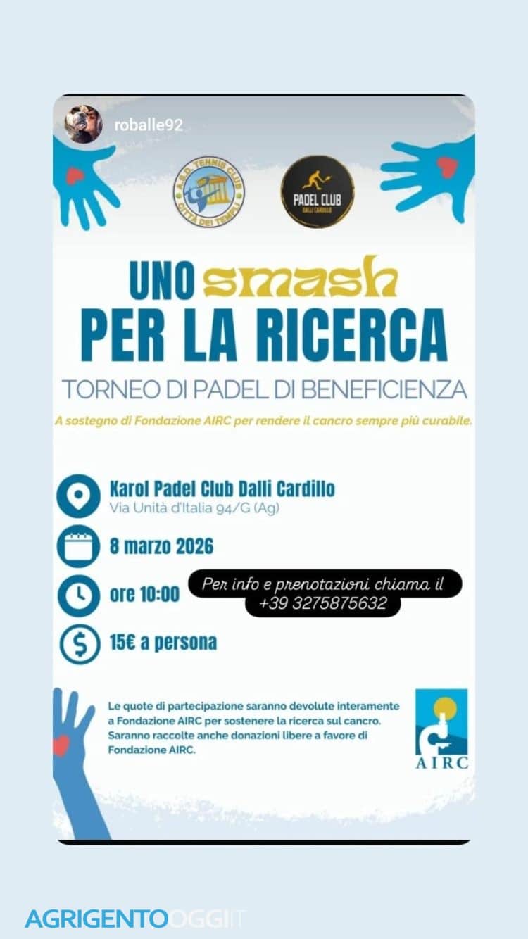 Lo sport che unisce, la solidarietà che fa squadra. Domenica 8 marzo 2026, alle ore 10:00, il Karol Padel Club Dalli Cardillo, in via Unità d’Italia 94/G ad Agrigento, ospiterà il torneo di beneficenza “Uno smash per la ricerca”, un’iniziativa che coniuga passione sportiva e impegno concreto a favore della scienza.