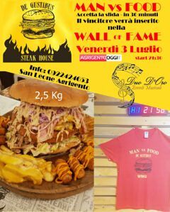 Sfida dal sapore americano a suon di mega panini dal peso di 2,5 chilogrammi ciascuno San Leone. Teatro della  singolare iniziativa “Man v Food “,  il ristorante De gustibus del Lungomare Falcone Borsellino di San Leone, lido di Agrigento.