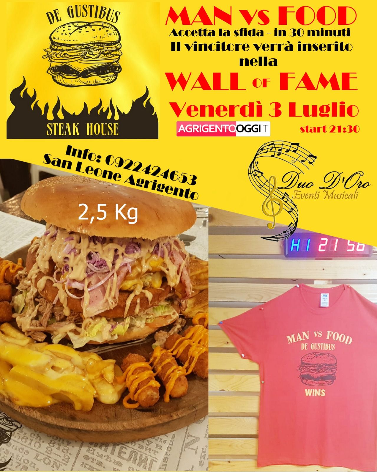 Sfida dal sapore americano a suon di mega panini dal peso di 2,5 chilogrammi ciascuno San Leone. Teatro della  singolare iniziativa “Man v Food “,  il ristorante De gustibus del Lungomare Falcone Borsellino di San Leone, lido di Agrigento.