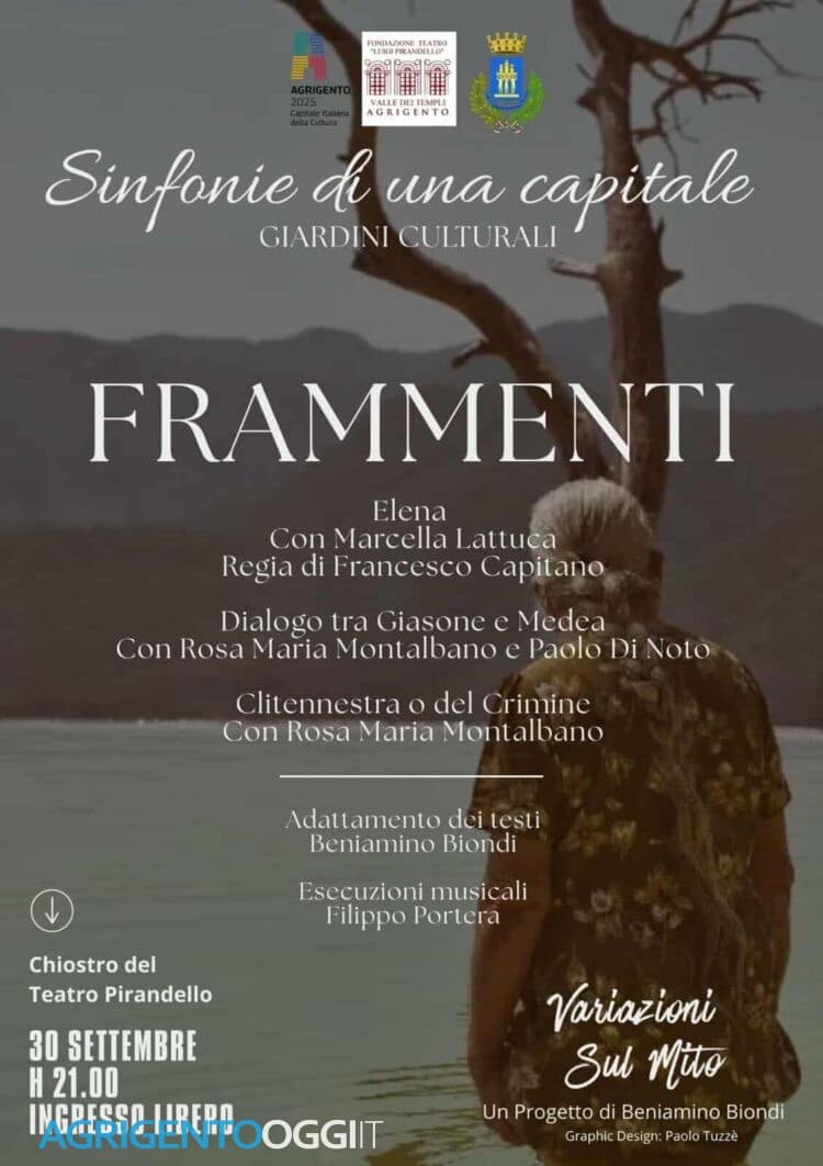 L’appuntamento di martedì 30 settembre ha per titolo “Frammenti” ed è un collage che vuole proporre una sorta di anticipazione di progetti futuri, presentando alcuni lavori in corso su testi scelti e adattati da Beniamino Biondi, soprattutto con riferimento a lungo lavoro sulla dimensione mitica realizzato di cui è esempio il primo monologo. Si inizia proprio con l’interpretazione di “Elena” del poeta neoellenico Yannis Ritsos, con Marcella Lattuca in scena e la regia di Francesco Capitano. Si prosegue con il dialogo di Medea e Giasone, dalla “Medea” di Euripide, nei passaggi di maggiore tensione emotiva e verbale, con la lettura di Rosa Maria Montalbano e di Paolo Di Noto. Si conclude con un’ultima lettura interpretata di “Clitennestra o del crimine”, monologo straordinario di Marguerite Yourcenar, ancora per la voce di Rosa Maria Montalbano. Tre voci di donne attraversano questa serata di teatro, incarnando la frattura tra mito e umanità. Elena di Ritsos, Clitennestra di Yourcenar e Medea nel suo confronto con Giasone ci guidano in un viaggio dentro il cuore spezzato e lucido delle eroine tragiche. Non più soltanto icone del passato, ma coscienze che interrogano il presente.