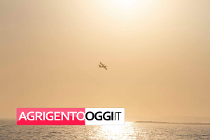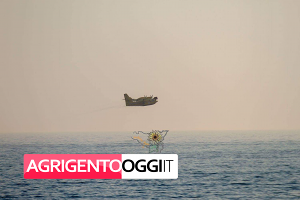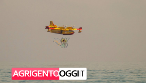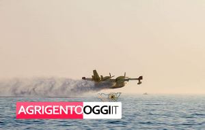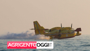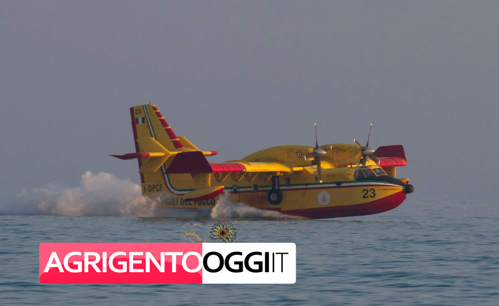 Vasto incendio boschivo in località Piano Corsa, a Racalmuto. Canadier in rifornimento a San Leone per  spegnere le fiamme.