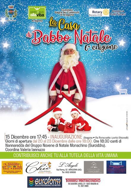 Sarà inaugurata oggi alle 17:45 la VI edizione della “Casa di Babbo Natale ” nella città di Aragona. L’iniziativa , attesa da piccoli e non, è promossa dal C.A.V.. “Giovanni Paolo II ” di Aragona, e viene inserita fra le manifestazioni a sfondo sociale del natale aragonese .
