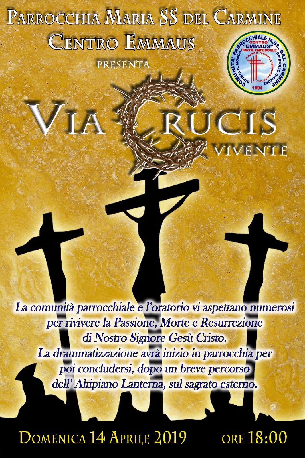 Il Centro Emmaus, realtà oratoriale della Parrocchia Maria Ss.ma del Carmine di Porto Empedocle – Piano Lanterna, presenta, Domenica 14 aprile 2019, alle ore 18,00, la Via Crucis Vivente, rappresentazione che vede coinvolti oltre 50 aderenti, tra animatori e iscritti.