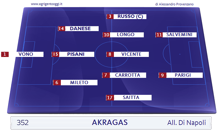 Probabile Formazione Akragas: (3-5-2) VONO, MILETO, PISANI, DANESE, SAITTA, CARROTTA, VICENTE, LONGO, RUSSO, SALVEMINI E PARIGI. Gli altri atleti a disposizione: LO MONACO – CATERNICCHIA – IOIO – SEPE – CANALE – NAVAS – BRAMATI – MOREO – GJUCI – FRANCHI. Alessandro Provenzano (tifoso dell’Akragas)