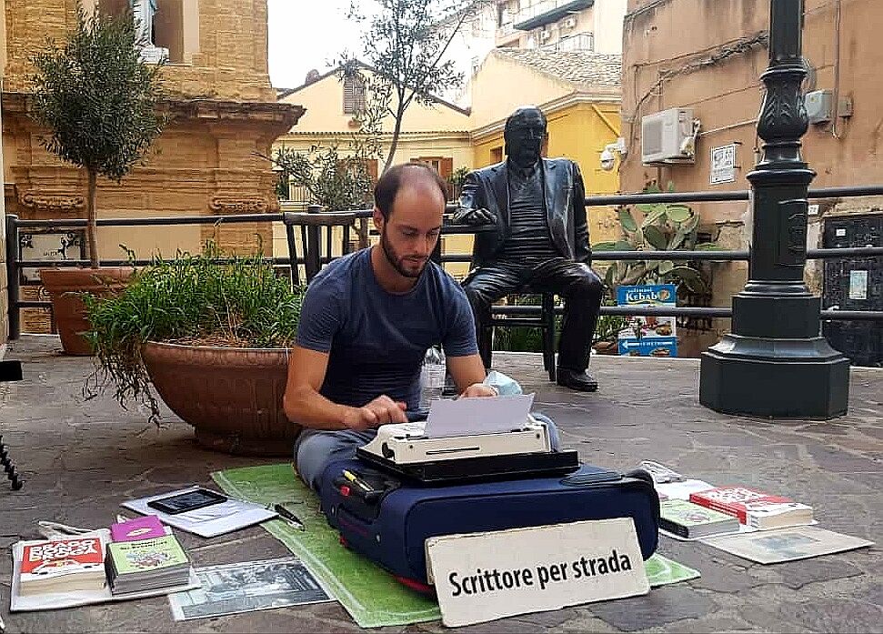 Si chiama Walter Lazzarin ed è un insegnante precario di Storia e Filosofia nonché uno “Scrittore per Strada”. Una sorta di personaggio che abita i marciapiedi delle strade d’Italia, perché a lui piace scrivere, e allora va a cercarsi le storie, ascolta conversazioni, conosce gente, evoca parole. In questi giorni si trova nella città dei templi, con la sua valigia piena di libri e una vecchia macchina da scrivere, di quelle che non se ne vedono più da tempo. Regala i suoi elaborati ai passanti di via Atenea che si fermano a guardarlo incuriositi. Trentanove anni, veneto d’origine, gira la penisola per cercare di vendere i suoi libri ( tra cui un romanzo dal titolo “Il drago che si droga” e altri volumi di tautogrammi). Ad Agrigento si è sistemato, e non poteva essere diversamente, nella “piazzetta dello scrittore”, seduto a terra ai piedi della scultura di Andrea Camilleri. Se in centro città c’era un posto adatto dove poter collocare il suo curioso ufficio, Walter Lazzarin l’ha trovato subito. “Ho deciso di rincorrere un sogno – spiega. – Un’utopia secondo alcuni: promuovo i miei libri girando per le strade d’Italia. I vagabondaggi mi hanno permesso di conoscere migliaia e migliaia di persone e centinaia di città. Sono nato a Padova – racconta. – Ho vissuto a Rovigo e dopo un anno mi sono trasferito a Roma. Campo di sola scrittura in attesa di vincere il concorso e fare il professore”. A vederlo vien da pensare a Totò nel film Miseria e Nobiltà, che scriveva lettere per gli analfabeti; lui racconta che in via Atenea gli è successo, con alcuni stranieri, che non sono ancora in confidenza con la nostra lingua, che gli hanno chiesto aiuto per scrivere messaggi o biglietti. Insomma una vita per strada. Però Walter non chiede soldi, ma dona biglietti dattiloscritti, e regala parole, sorrisi e saluti.