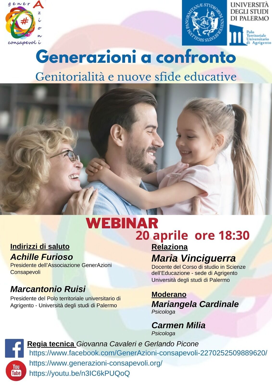 Dopo gli indirizzi di saluto dell’Ing Achille Furioso, Presidente dall’Associazione GenerAzioni Consapevoli e del Prof. Marcantonio Ruisi, Presidente del Polo territoriale universitario di Agrigento dell’Ateneo di Palermo, relazionerà la Prof.ssa Maria Vinciguerra docente di pedagogia generale dell’Università degli studi di Palermo autrice di diverse monografie, di numerosi articoli e contributi inerenti le relazioni familiari e la genitorialità. Il webinar sarà moderato dalle psicologhe Mariangela Cardinale e Carmen Milia e la regia curata da Giovanna Cavaleri e Gerlando Picone.