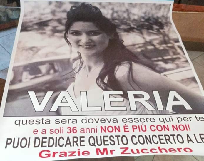 Dedica speciale da parte di Zucchero Fornaciari a Valeria Boscarino durante il suo concerto di giovedì sera al teatro Valle dei templi di Agrigento. Il cantautore emiliano rivolgendosi ai familiari della giovane mamma di 36 anni scomparsa improvvisamente a seguito di un malore la notte del 7 luglio scorso, lasciando sgomenti e addolorati tutti i familiari, ha voluto cantare per lei “Dune mosse”uno dei brani preferiti da Valeria. ” A quel concerto dovevamo esserci tutti” – ha scritto il marito sui social, mostrando un poster con la foto della moglie, poster che è stato mostrato a Zucchero proprio la sera del concerto. Grande l’ emozione dei familiari della giovane Valeria per la sensibilità dimostrata da Zucchero.